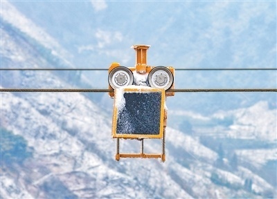 浙江省杭州市,自动除冰机器东说念主检测到澄澈覆冰厚度达到预警值,自动开启除冰步地。 胡建强摄(影像中国)