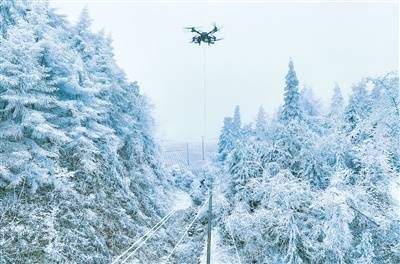 湖北省恩施市开云kaiyun官方网站,除冰机器东说念主在无东说念主机牵引下开展除冰功课。 张远明摄(东说念主民视觉)