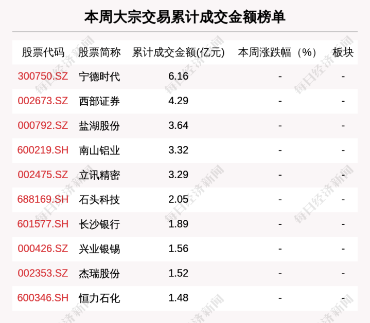 本周大批交游累计成交金额前3的公司是宁德期间、西部证券、盐湖股份,累计成交金额划分为6.16亿元,4.29亿元,3.64亿元。