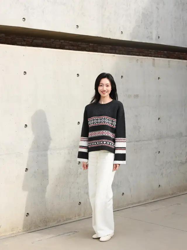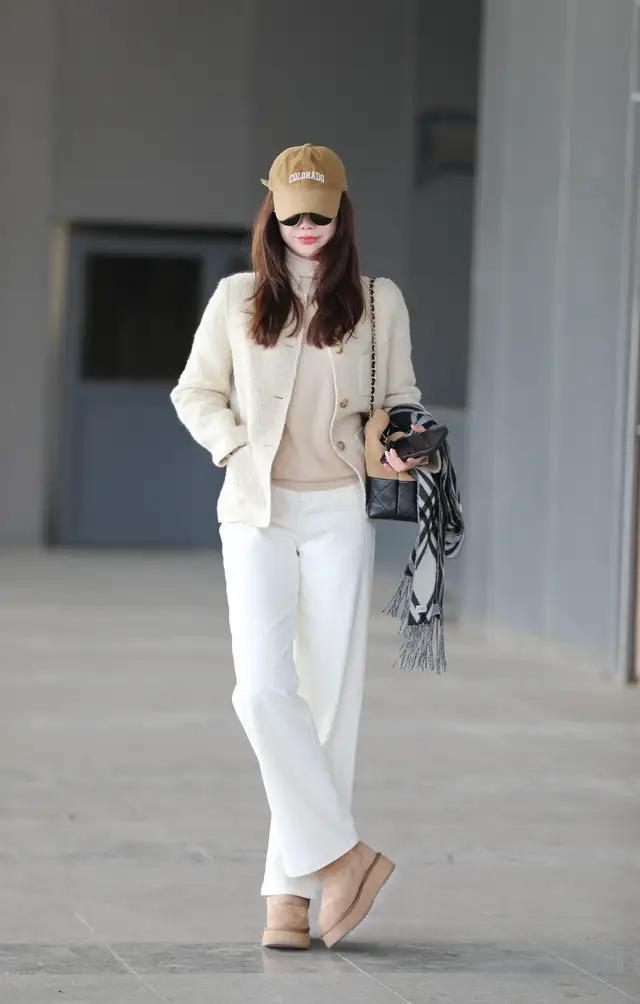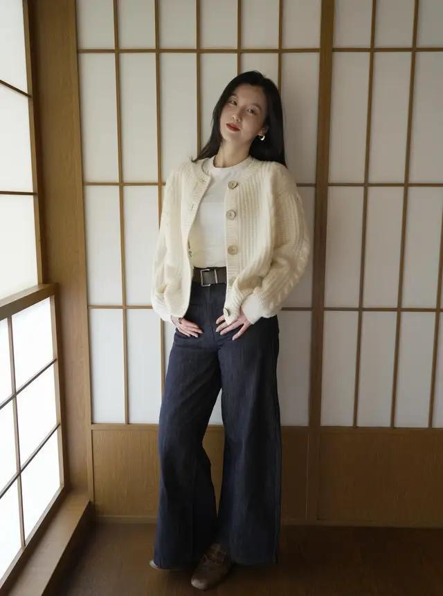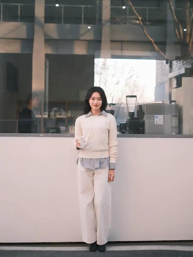 淌若你所处的环境气温比拟温煦,或者是居家的技艺有空调有地暖,那么我们满盈可以把大衣外衣脱掉,只穿一件浅黄色的诚恳毛衣开衫,内搭白色 T 恤。
