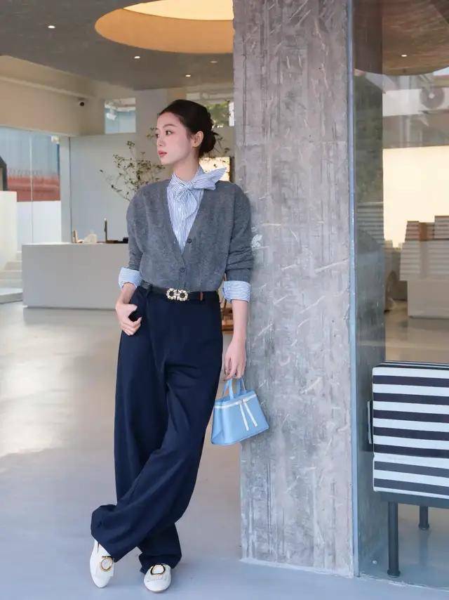 当下用叠穿的穿搭容貌正合适,我们可以采用一件比拟有质感的 V 领灰色诚恳开衫,叠穿一件蓝色条纹的小众衬衫和一条藏蓝色的西装裤,脚穿一对白色乐福鞋。