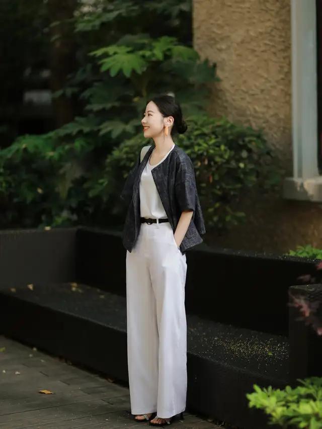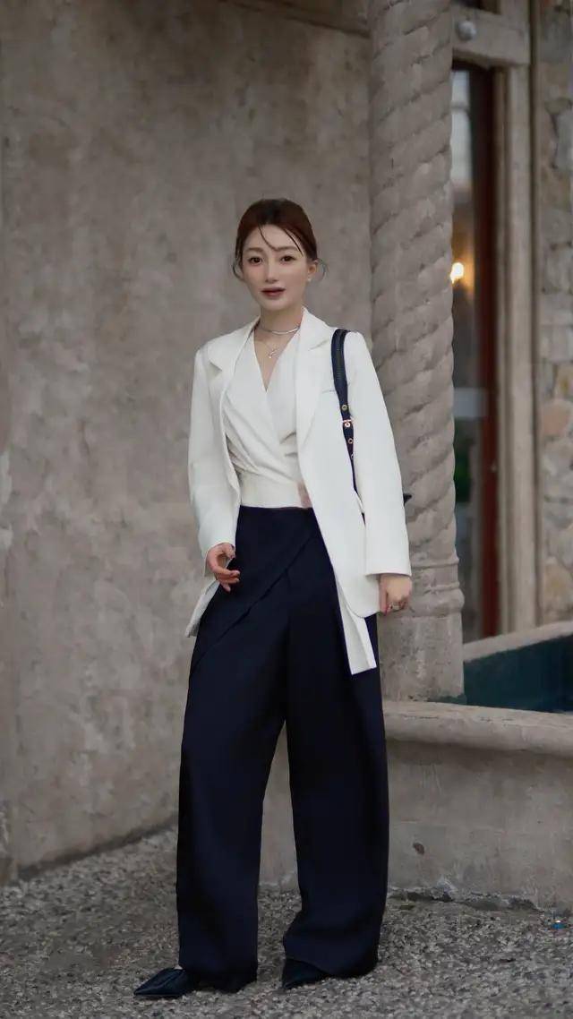 西装外衣穿在身上自己就很干练,不外相通不要径直采用玄色,我们可以像上头这位前锋博主一样,径直用一件白色的西装外衣搭配一条藏蓝色的高腰收腰款西装阔腿裤,脚穿一对浅口单鞋,既能栽种全体造型的干练气质又兴盛不突兀。