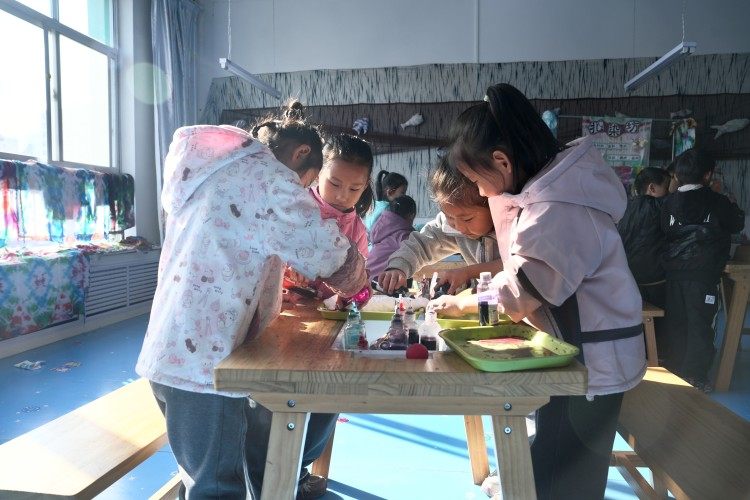 在府谷县第六幼儿园,孩子们正在学习扎染。