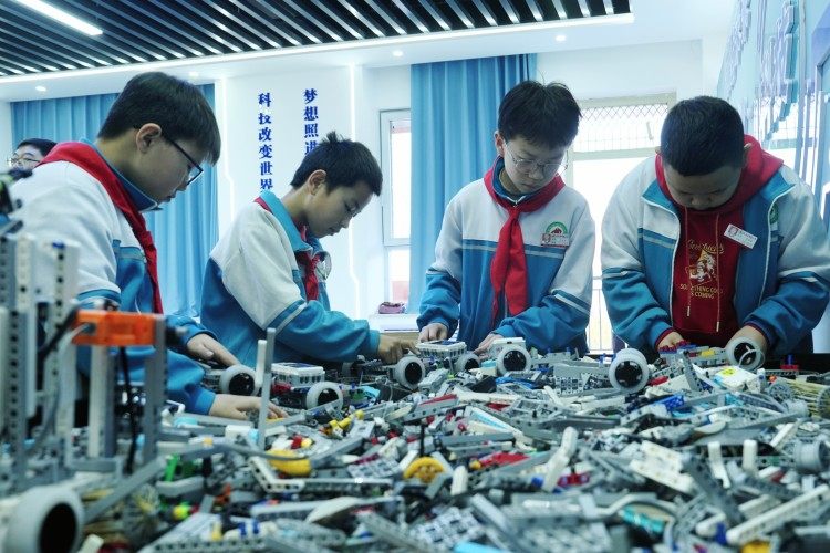 府谷县明德小学学生正在拼装机器东谈主。