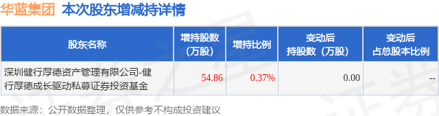 证券之星音问,1月2日华蓝集团发布公告《华蓝集团:简式权利变动申报书(一)》,其推动深圳健行厚德金钱贬责有限公司-健行厚德成长初始私募证券投资基金于2024年10月29日至2024年12月23白昼所有增握54.86万股,占公司当今总股本的0.371%,变动本事该股股价高潮38.67%,范畴12月23日收盘报14.99元。