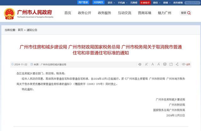 新京报讯 11月22日,广州市住房和城乡确立局、广州市财政局国度税务总局、广州市税务局发布对于取消我市等闲住宅和非等闲住宅圭表的示知。
